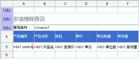 A5 单元格表达式为:=ds1.select(产品 ID),目的是取数 ds1 结果集中所有的产品。