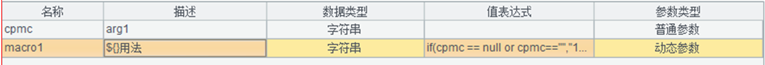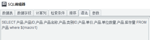 macro1 是动态参数,根据 cpmc 拼接查询条件,值表达式为:if(cpmc == null or cpmc==” ”,”1=1″,”产品名称 like ‘%”+replace(@cpmc,”,”,”%’ or 产品名称 like ‘%”)+”%’”)。这里的动态参数,它不仅是用于在报表结果页面里面显示查询条件的拼接结果,而且也用于对 sql 进行数据筛选。
