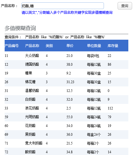 但是用户的需求往往是无止境的!最典型就是把这两种好使的方法结合起来,也就是两种查询的结合–在参数框中输入多个关键字,根据多个关键字进行模糊查询。比如,用户要根据产品名称进行多值模糊查询,当输入为“奶酪, 糖”时,希望找出产品名称中含有奶酪或糖的产品列表,如下图所示: