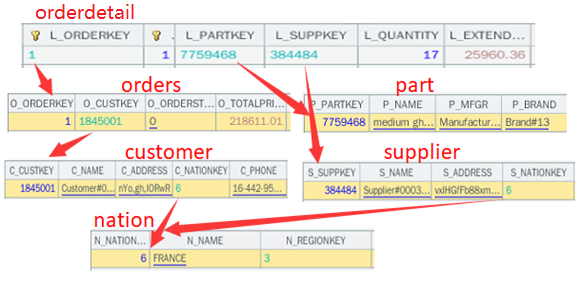 图中只列了orderdetail的第一条记录的预关联情况,其它记录与此类似。限于版面宽度,各表只列出了部分字段。