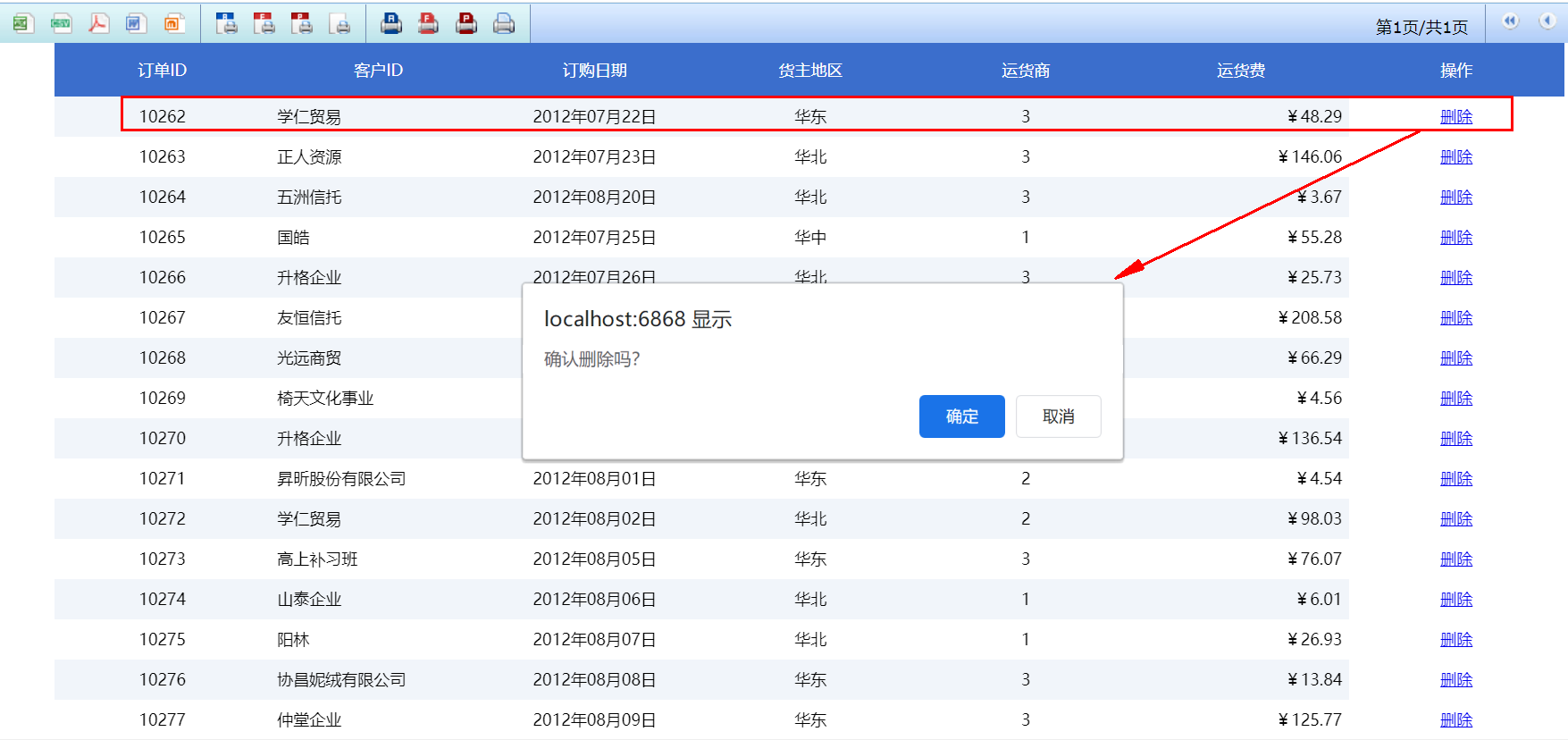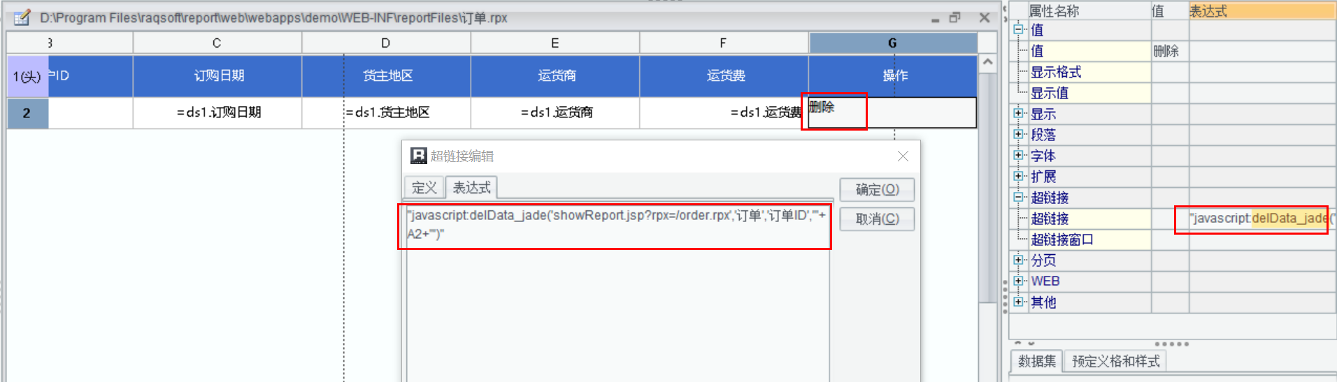 超链接表达式为:“javascript:delData_jade(‘showReport.jsp?rpx=/order.rpx’,‘订单’,‘订单 ID’,’”+A2+“’)”