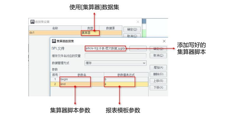 设置报表数据集,选择集算器数据集类型,添加上述准备好的集算器脚本文件,并设置报表参数与集算器脚本参数对应