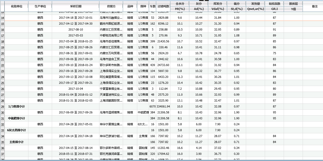 大神们。这上面的截图是样板,我需要做成这样。上面的每一条数据都是按照:生产单位,供煤方,品种,煤种 四个条件进行的分组,数据是分组后的平均值。但是小计只是用煤种来做小计。