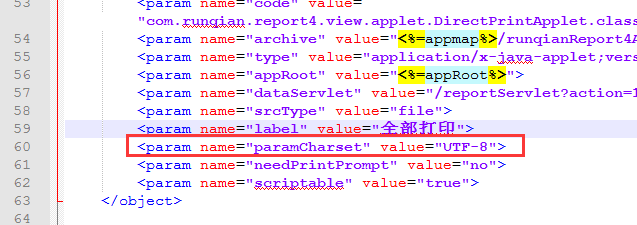 在批量打印 jsp 页面标签内,只需增加一个 paramCharset 即可,此属性为指定传递的参数编码,和报表展现 jsp、xml 配置内编码保持一致。