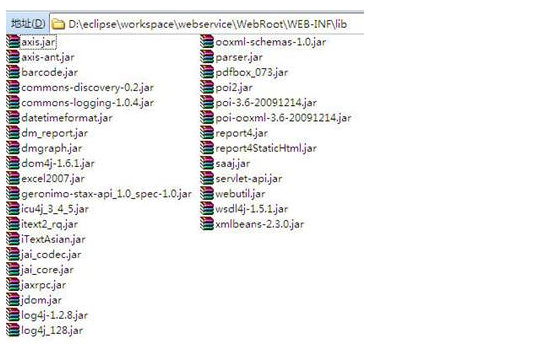 http://ws.Apache.org/axis/网站下载 Axis 安装包,在 MyEclipse 中建立了一个 web 项目。并将润乾报表相关的 jar 包也拷贝到项目 lib 文件夹下。所有的 jar 包列表如下: