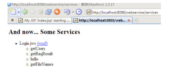 在浏览器地址栏输入访问http://127.0.0.1:8088/webservice/services,可以看到已有的 Web Service,看是否有方法显示,有显示,则代表服务端提供的接口可以成功访问了。其中 getRaqResult 即为润乾报表提供的报表服务。如下图: