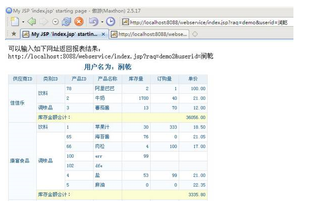 本例子在 index.jsp 页面获取 URL 里的参数“userID”和“raq”值, 创建一个服务 (service) 调用(call),通过 service 创建 call 对象,然后设置 service 所在 URL,调用 getRaqResult 方法并传入参数值,最后将返回结果输出到页面。运行结果如下: