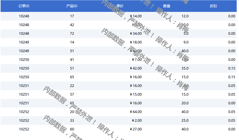 某银行,内部系统在查询相应报表的时候,为防止数据泄密,展现导出的结果上需要有水印信息如:“内部数据,严禁外泄!操作人:XXX”。