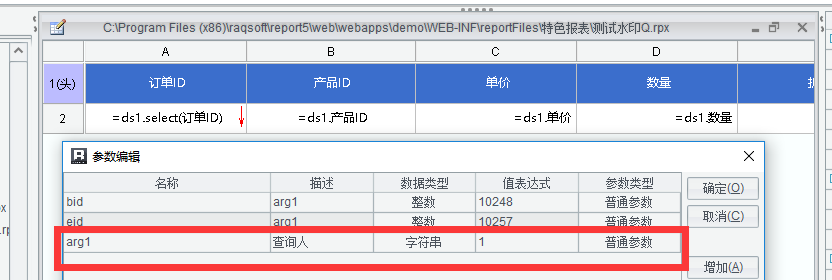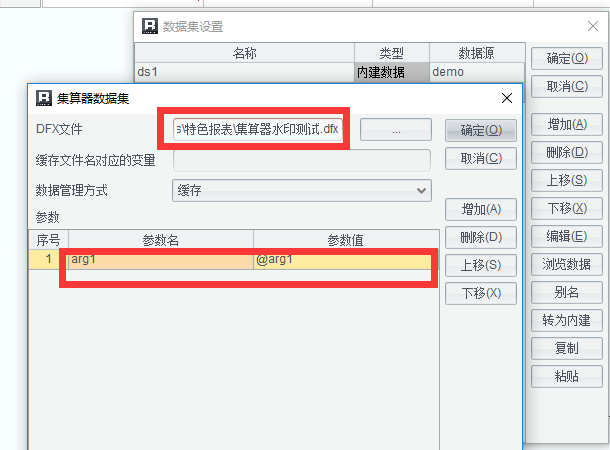 报表菜单——数据集——增加——集算器点击确定,设置集算器的路径以及报表与集算器对应参数列表。