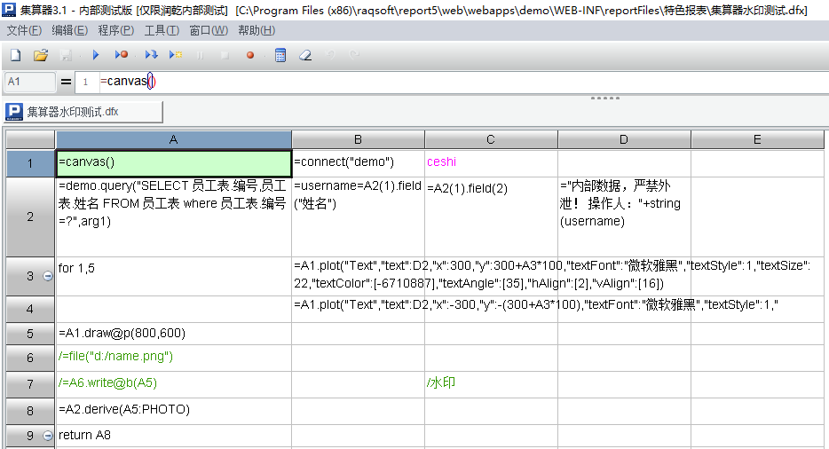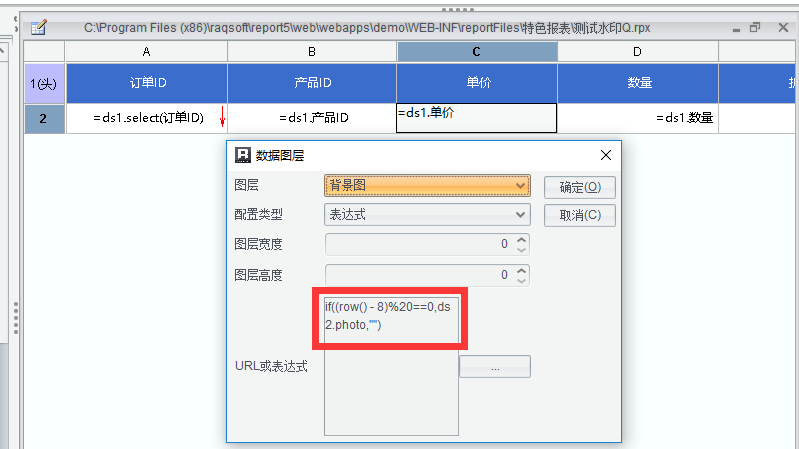 通过集算器动态生成水印背景图,并且该集算器作为报表数据集,在报表背景图设置的地方写数据集表达式获得到生成的图片进行展现。