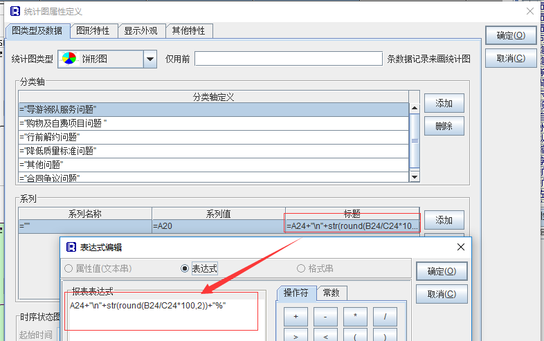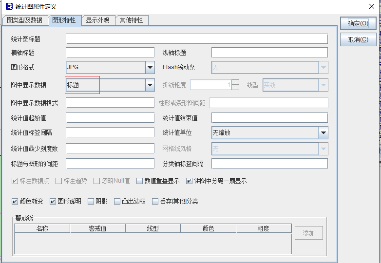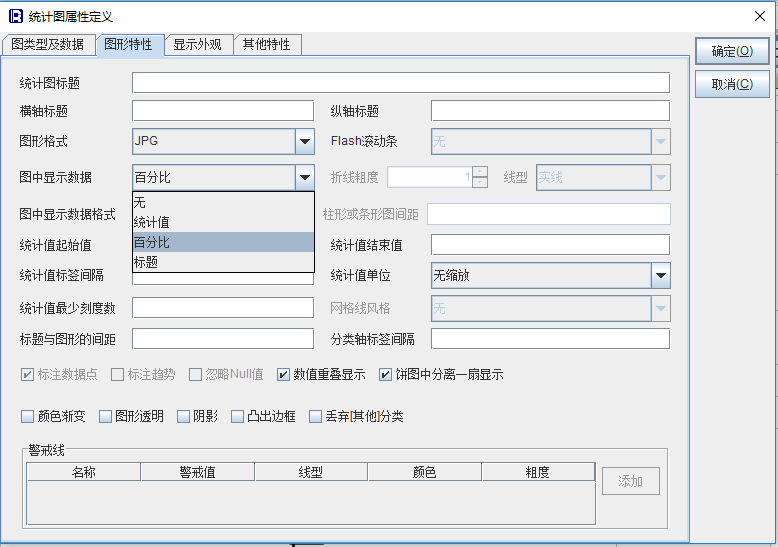 V4 版本中统计图的图形特性中图中显示数据可以是统计值,百分比还可以是标题。