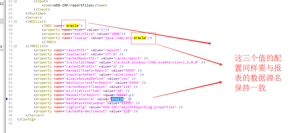 3)在 raqsoftConfig.xml(目录:…\v5demo\WEB-INF) 指定 JNDI 的 name 值 、 lookup 的 value 值和 defDataSource 的 value 值,如下图: