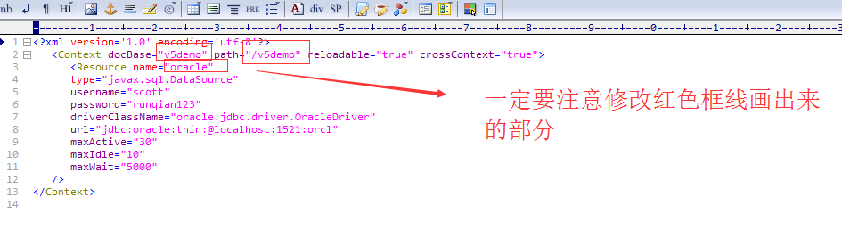 2)在 apache-tomcat\conf\Catalina\localhost 目录下新建 xml 配置数据库连接池信息,需要注意 这个 xml 文件名一定要跟应用名一致,即 v5demo.xml, 内容如下: