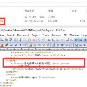 将已获取的授权文件放置到 demo 应用的…\WEB-INF\classes 文件夹下,然后向上返回一级目录打开 \WEB-INF 文件夹,找到 raqsoftConfig.xml 文件,找到标签修改其中标签的节点值  如下图