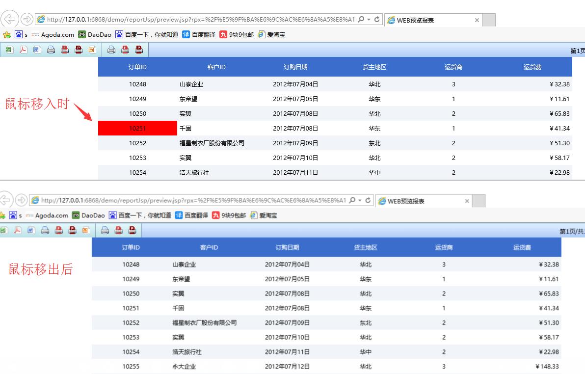 下面以润乾报表 5 自带报表实例【订单.rpx】为例,实现 鼠标移入高亮显示