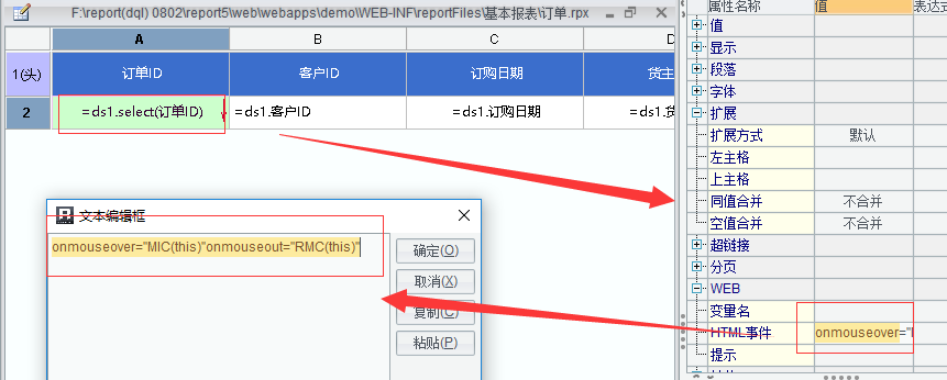 2. 报表中给 A2 单元格定义 HTML 事件 如下图: