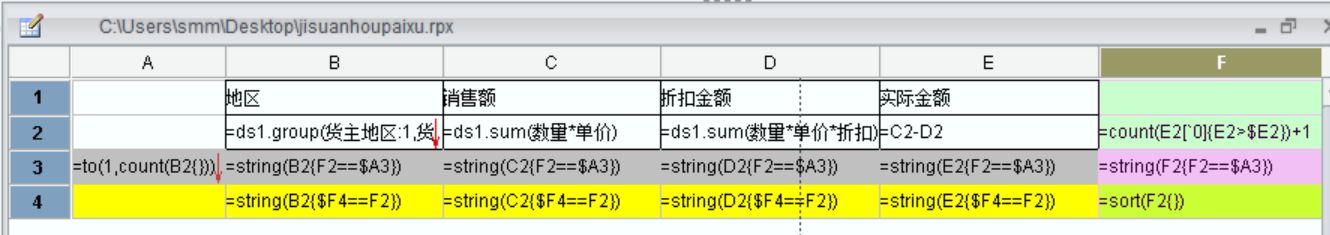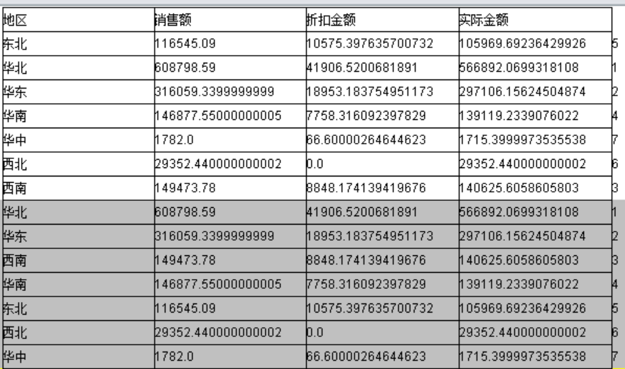 并且在 A3 单元格中写入表达式:=to(1,count(B2{})),控制该行进行纵向扩展,并且扩展出原有地区所对应的行数,这样报表展现时就会在下方多扩展出一片数据区域,并且第一列为 1,2,3 这种形式,因为前面在 F2 单元格中根据实际金额做了对应的排名,出来的值也是 1,2,3 形式,所以可以根据排名相同进行数据选择,在 B3 单元格中写入表达式:=B2{F2==$A3},这样报表就会展现成下面形式:
