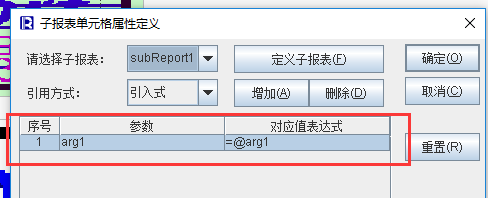 第三步:在主表中对应子表打开“子报表单元格属性定义”增加参数 arg1 如下图: