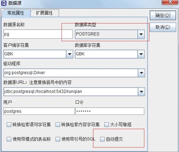更改自动提交,由于 postgresQL 库要设置自动提交为 false,所以将自动提交复选框的勾去掉。