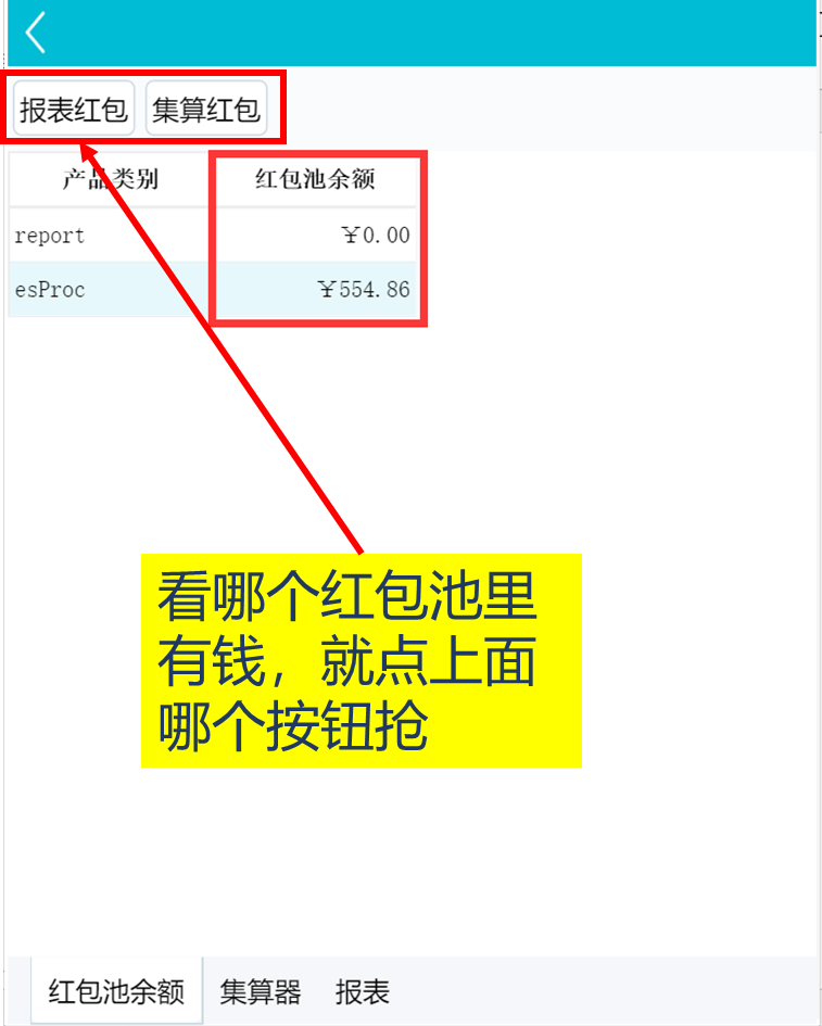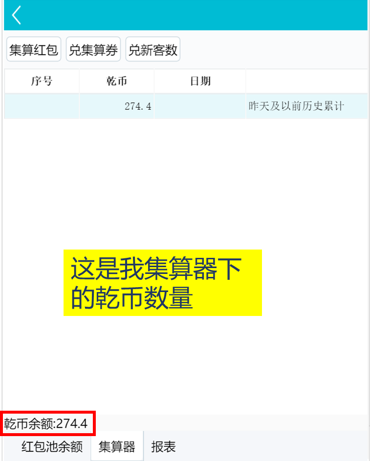 出现这个提示是因为抢红包是需要消耗乾币(积分)的,** 一个乾币抢一次!!!** 你可以在上图最下面的另外两个【集算器】和【报表】选项卡下查看乾币数量。