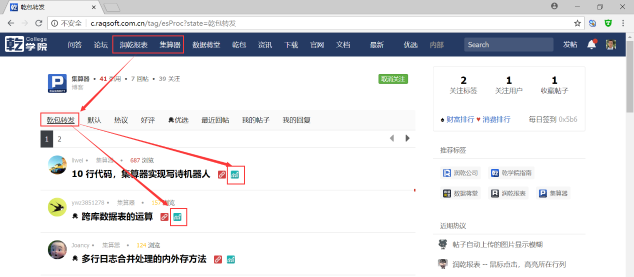 登录后,可以直接选择导航栏上的【润乾报表】和【集算器】栏目,查找带有标志的文章进行转发。