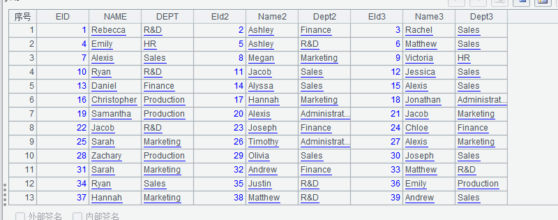 | 5 | =A2.derive(A3(#).EID:EId2,A3(#).NAME:Name2,A3(#).DEPT:Dept2,A4(#).EID:EId3,A4(#).NAME:Name3,A4(#).DEPT:Dept3) |