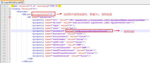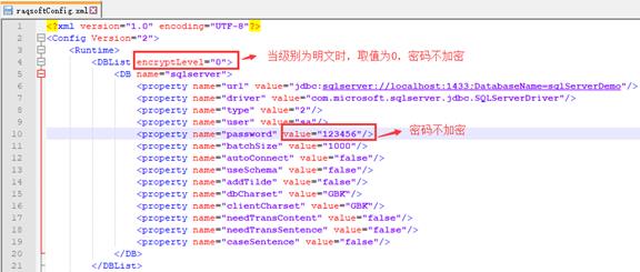 【配置方法】:raqsoftconfig.xml 中 DBList 中 encryptLevel 属性值配置,当值是 0 时对应明文,1 对应加密