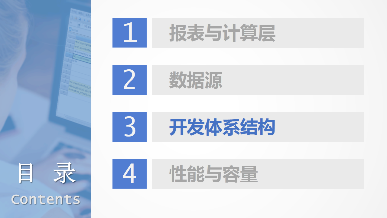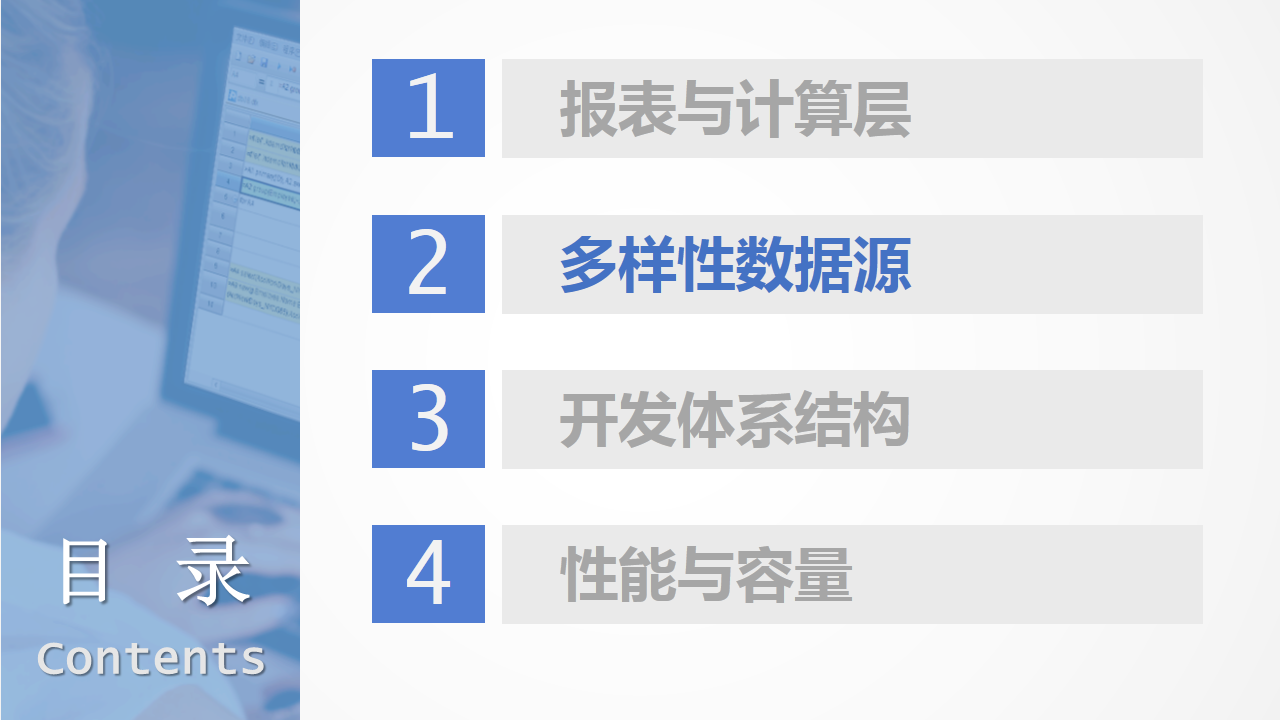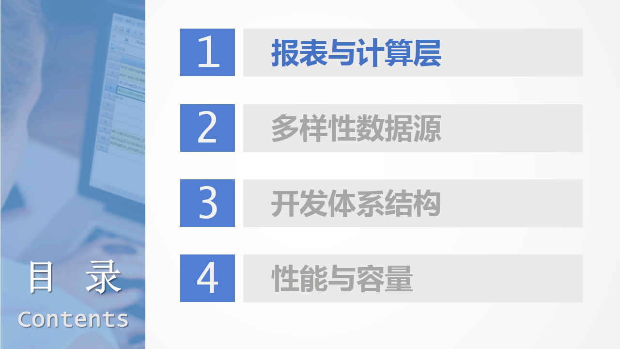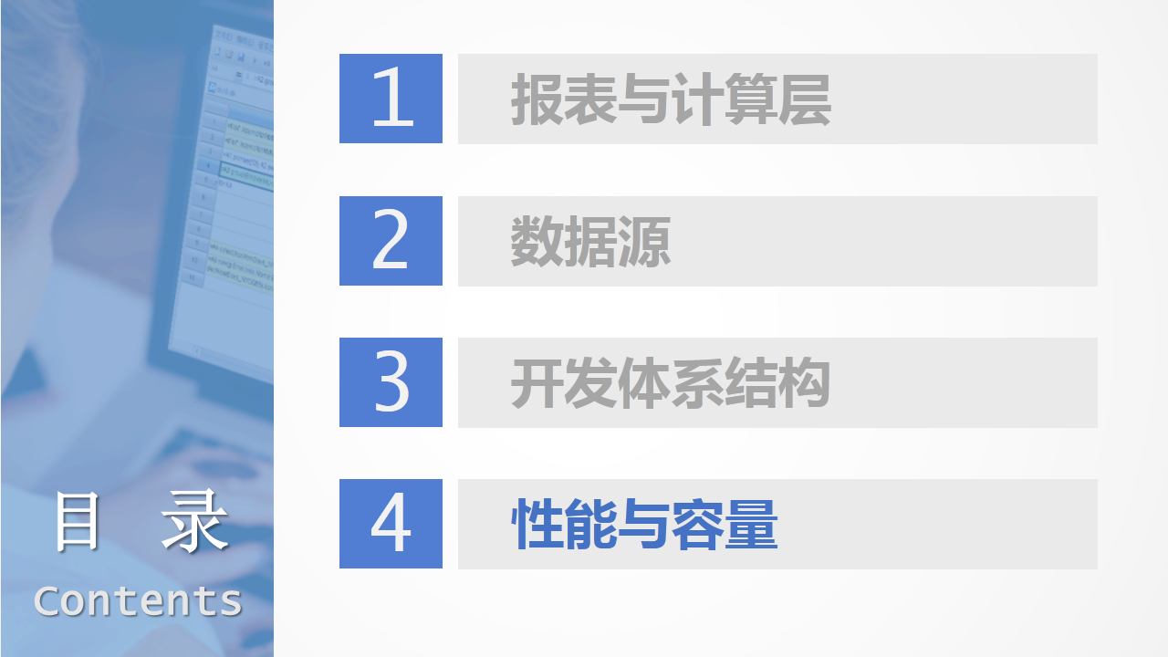 本片通过《报表展现》、《数据源》、《开发体系结构》、《性能与容量》这四大部分,介绍了如何使用计算脚本来提升报表的开发效率