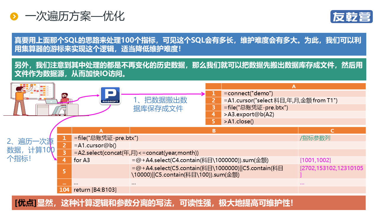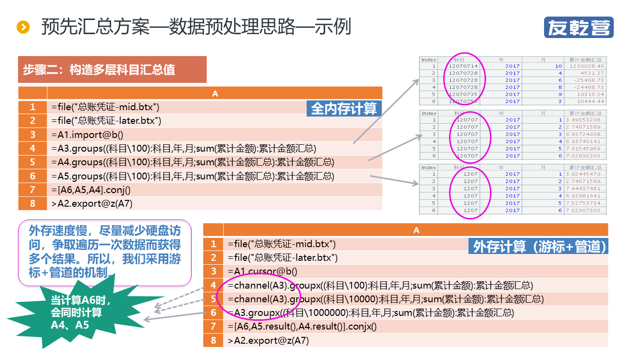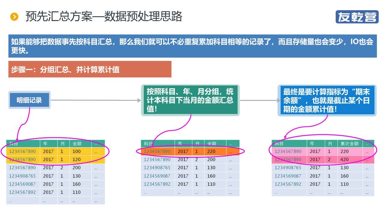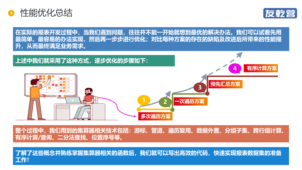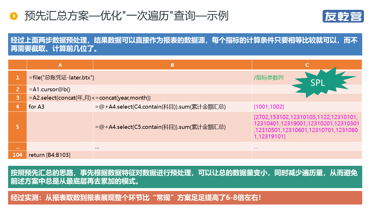 在实际的报表开发过程中,当我们遇到问题,往往并不能一开始就想到最优的解决办法。我们可以试着先用最简单、最容易的办法实现,然后再一步步进行优化;对比每种方案的存在的缺陷及改进后所带来的性能提升,从而最终满足业务需求。本文中我们就采用了这种方式,逐步优化的步骤如下:1、多次遍历方案;2、一次遍历方案;3、预先汇总方案,查询部分在 2 的基础上进行优化;4、有序计算方案。当然,好的想法也需要好的工具配合,并且能够实现它,集算器就是这把利器。赶快去乾学院看个究竟吧!多层科目任意组合汇总表的性能优化