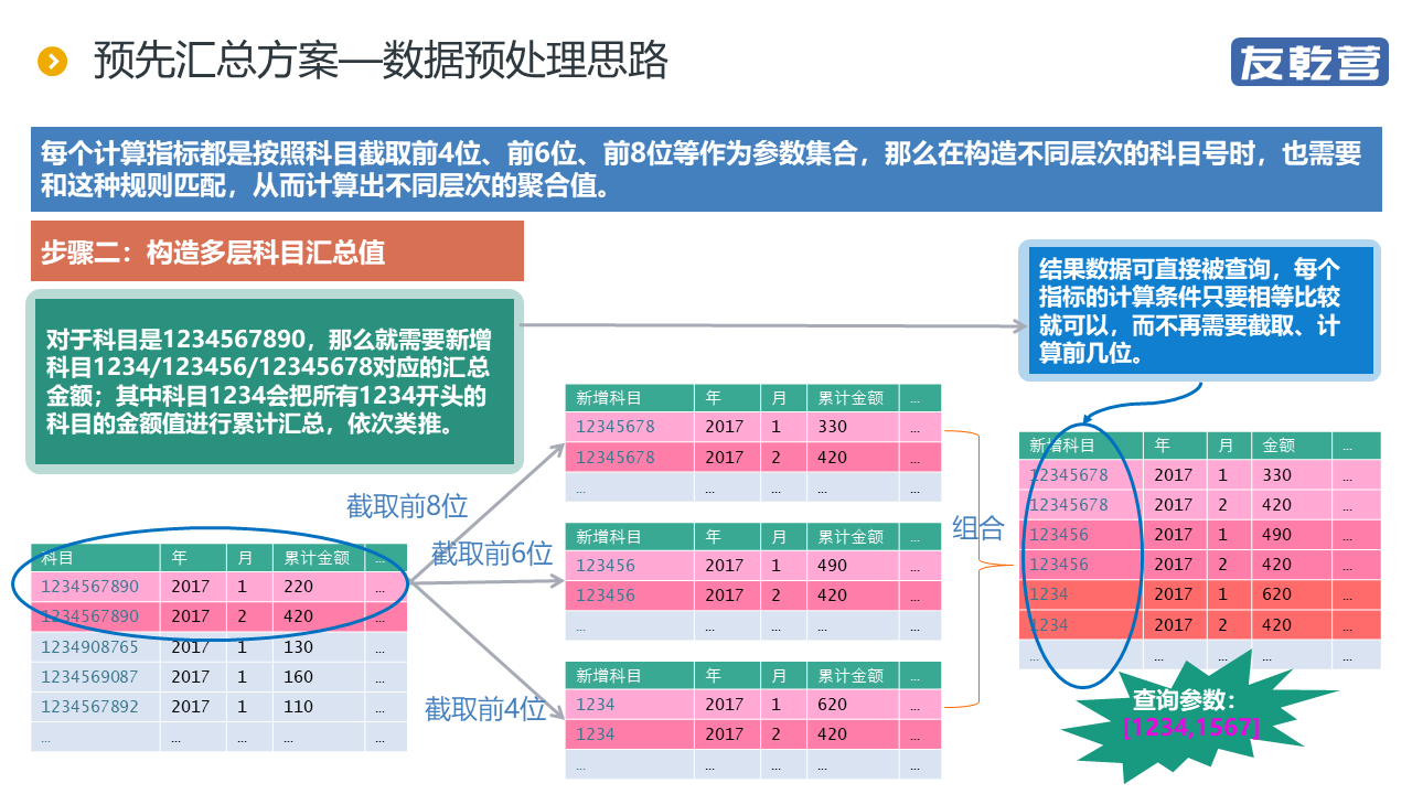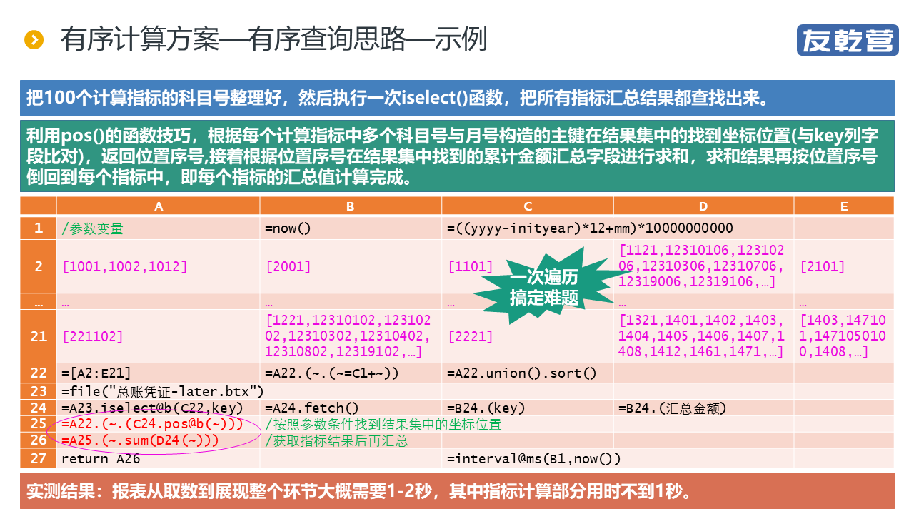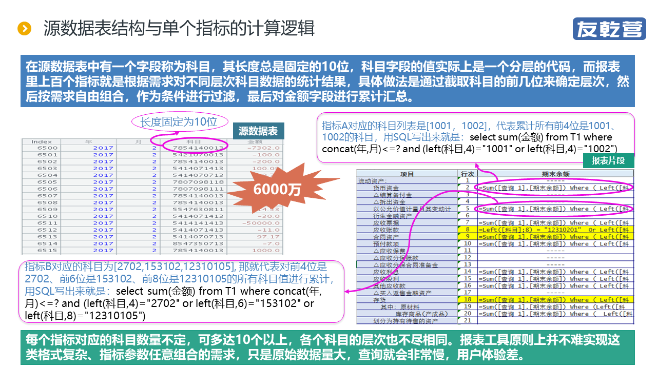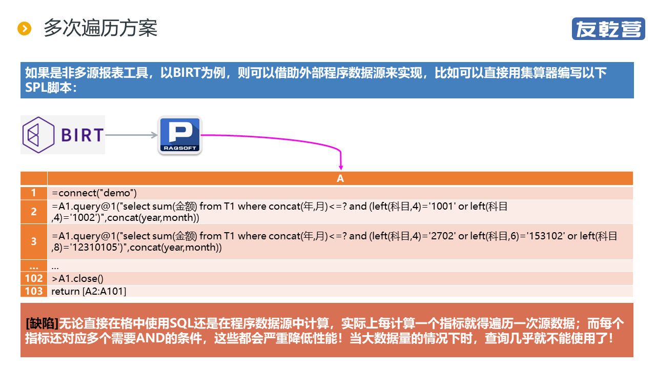 在实际的报表开发过程中,当我们遇到问题,往往并不能一开始就想到最优的解决办法。我们可以试着先用最简单、最容易的办法实现,然后再一步步进行优化;对比每种方案的存在的缺陷及改进后所带来的性能提升,从而最终满足业务需求。本文中我们就采用了这种方式,逐步优化的步骤如下:1、多次遍历方案;2、一次遍历方案;3、预先汇总方案,查询部分在 2 的基础上进行优化;4、有序计算方案。当然,好的想法也需要好的工具配合,并且能够实现它,集算器就是这把利器。赶快去乾学院看个究竟吧!多层科目任意组合汇总表的性能优化