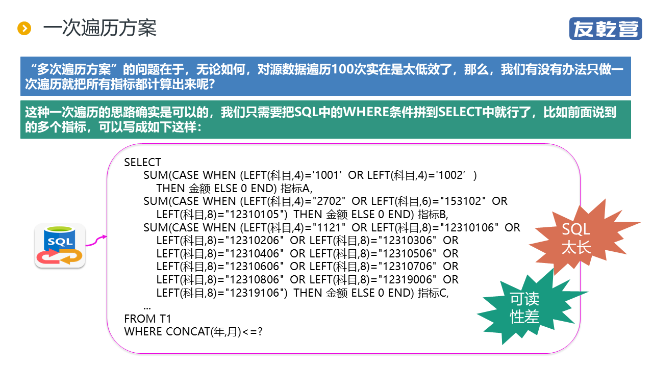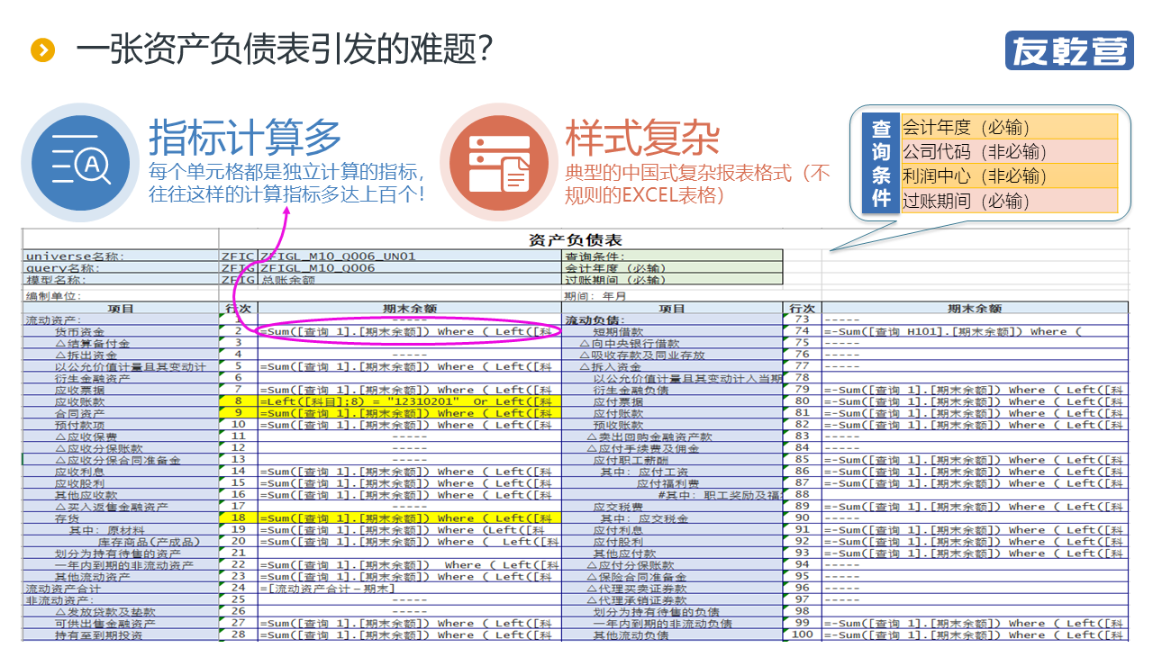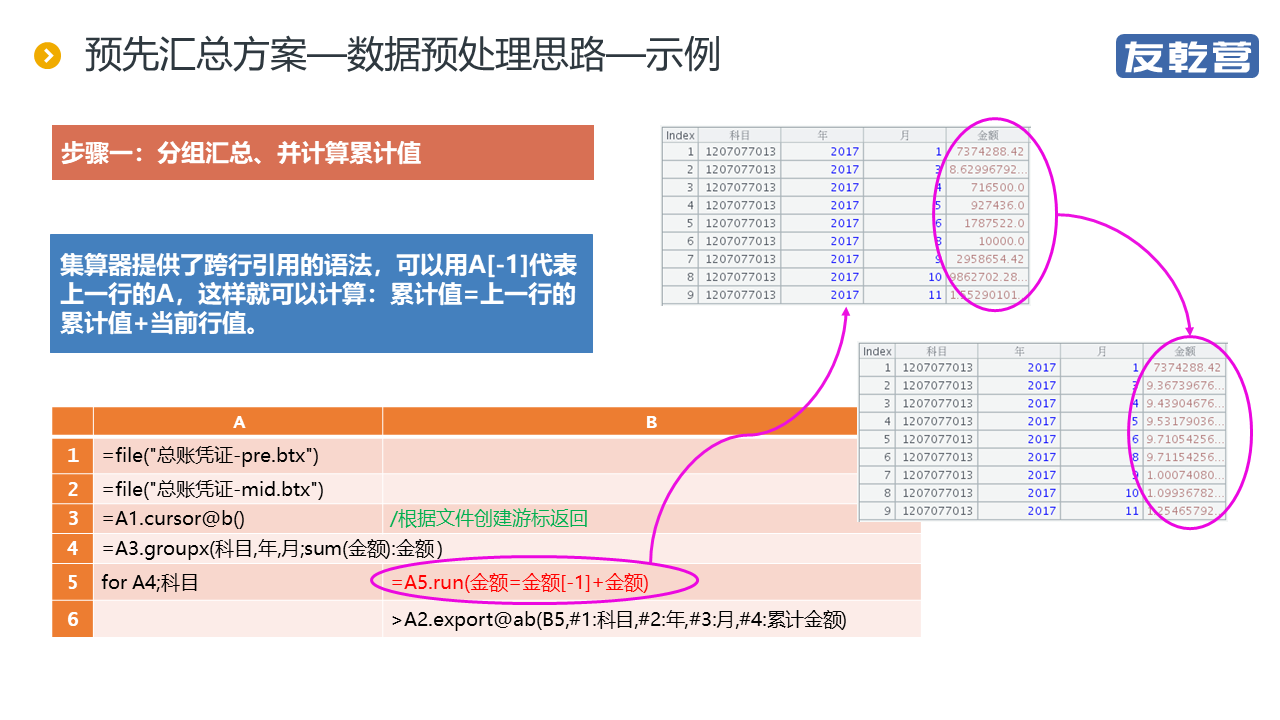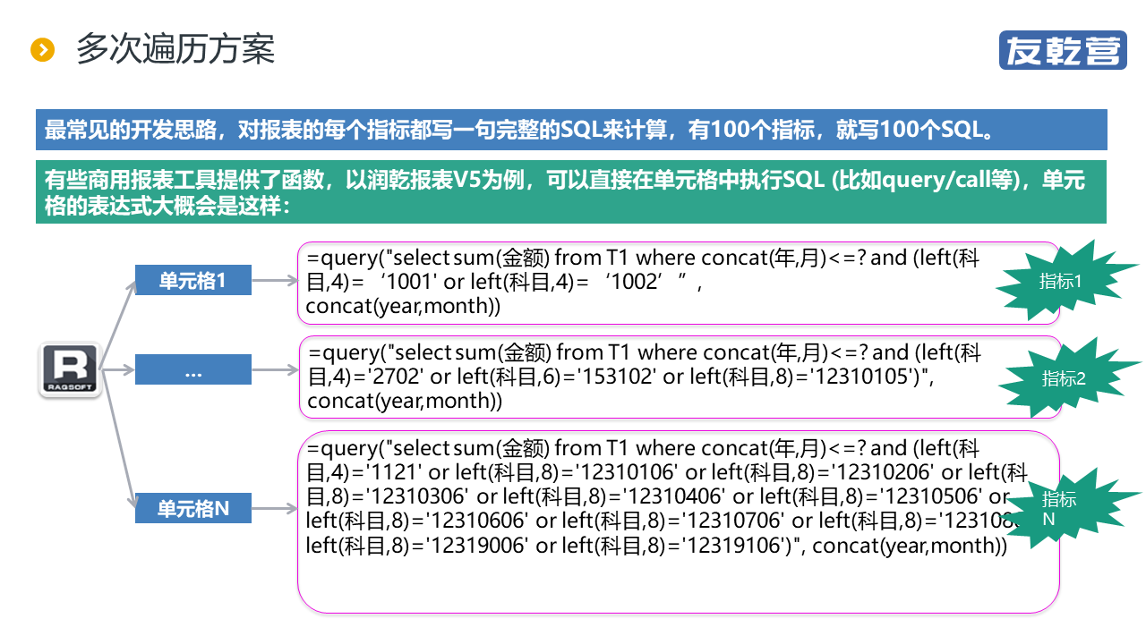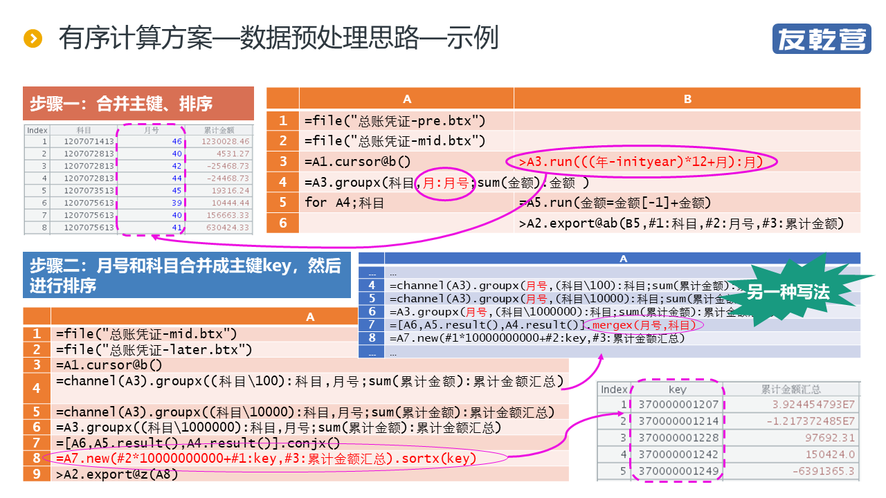 在实际的报表开发过程中,当我们遇到问题,往往并不能一开始就想到最优的解决办法。我们可以试着先用最简单、最容易的办法实现,然后再一步步进行优化;对比每种方案的存在的缺陷及改进后所带来的性能提升,从而最终满足业务需求。本文中我们就采用了这种方式,逐步优化的步骤如下:1、多次遍历方案;2、一次遍历方案;3、预先汇总方案,查询部分在 2 的基础上进行优化;4、有序计算方案。当然,好的想法也需要好的工具配合,并且能够实现它,集算器就是这把利器。赶快去乾学院看个究竟吧!多层科目任意组合汇总表的性能优化