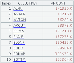 | O_ORDERKEY O_CUSTKEY O_ORDERDATE O_TOTALPRICE 10262 RATTC 1996-07-22 14487.0 10263 ERNSH 1996-07-23 43818.0 10264 FOLKO 2007-07-24 1101.0 10265 BLONP 1996-07-25 5528.0 10266 WARTH 1996-07-26 7719.0 10267 FRANK 1996-07-29 20858.0 10268 GROSR 1996-07-30 19887.0 10269 WHITC 1996-07-31 456.0 10270 WARTH 1996-08-01 13654.0 ... |