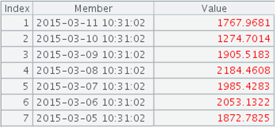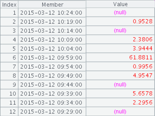 =A1.(demo.query(“select sum(v) from tv where t>? and t<=?”,~, ifn(~[-1],now()))).new(~.v:Value) |