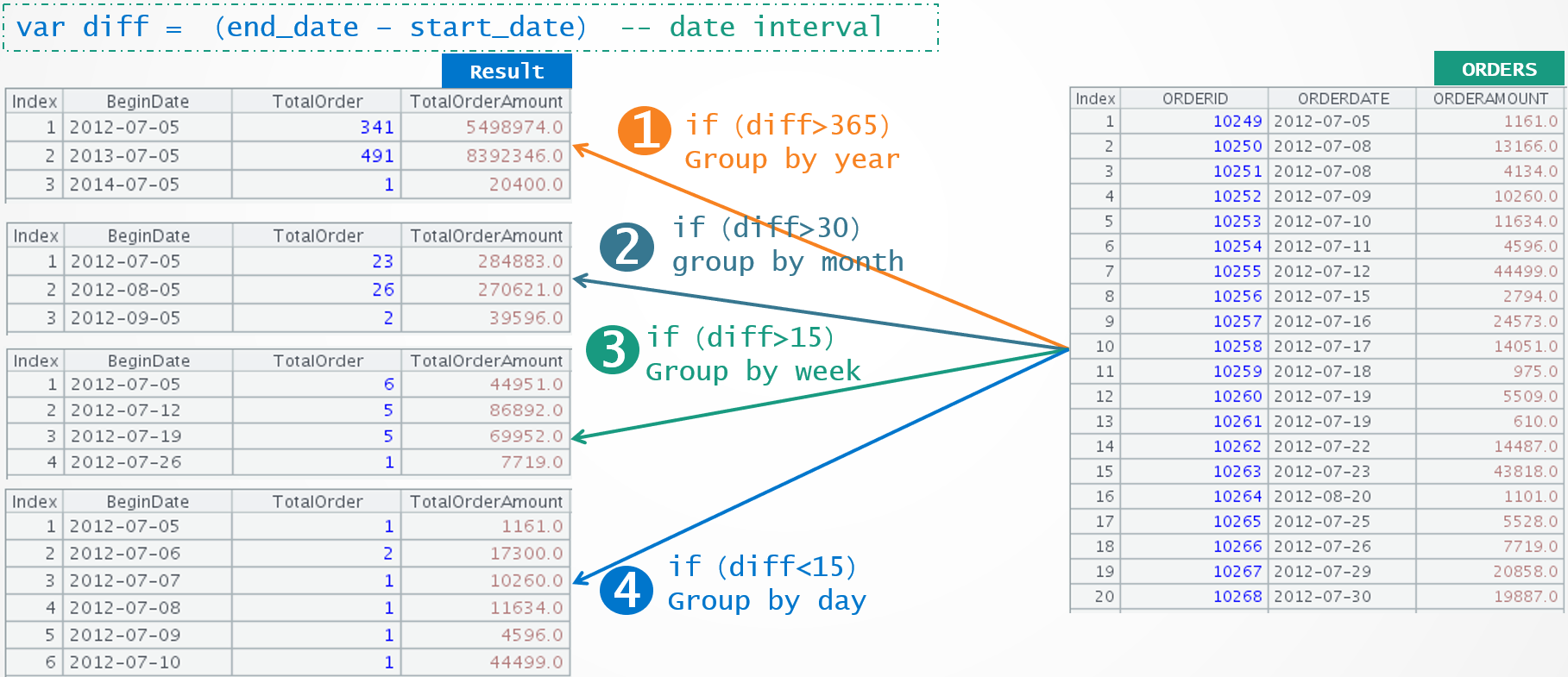=A2.group(A1.pseg(ORDERDATE);~.count(ORDERID):TotalOrder,round(~.sum(ORDERAMOUNT),2):TotalOrderAmount,A1(#):BeginDate) |
