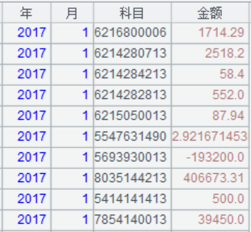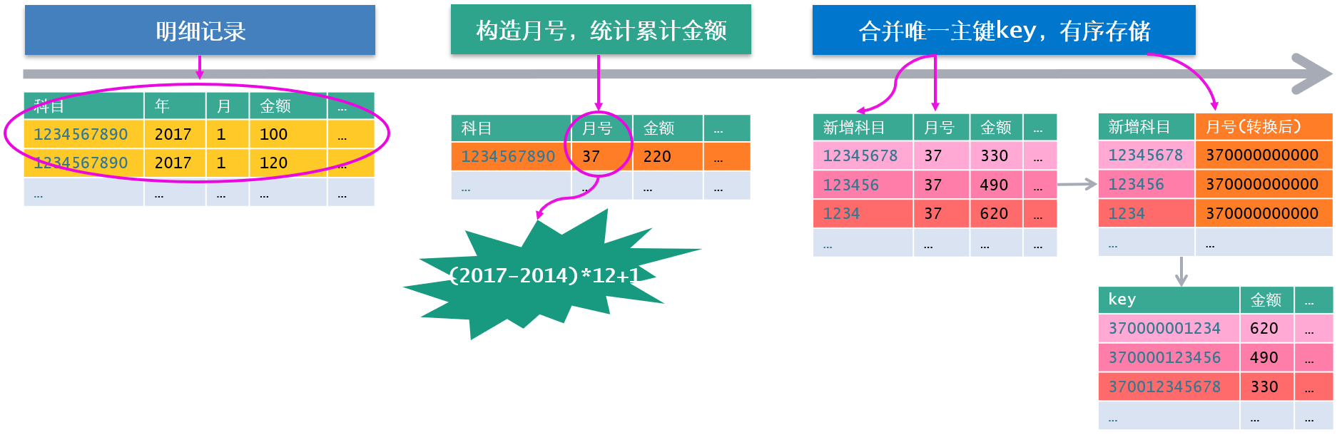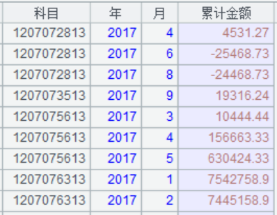 第二步,对科目前 N 位分别汇总金额(比如科目是 1234567890,新增科目号 1234、123456、12345678 对应的汇总金额;其中科目 1234 会把所有 1234 开头的科目的金额值进行累计汇总,依次类推);再利用上一步生成的月号和科目合并成唯一主键 Key。