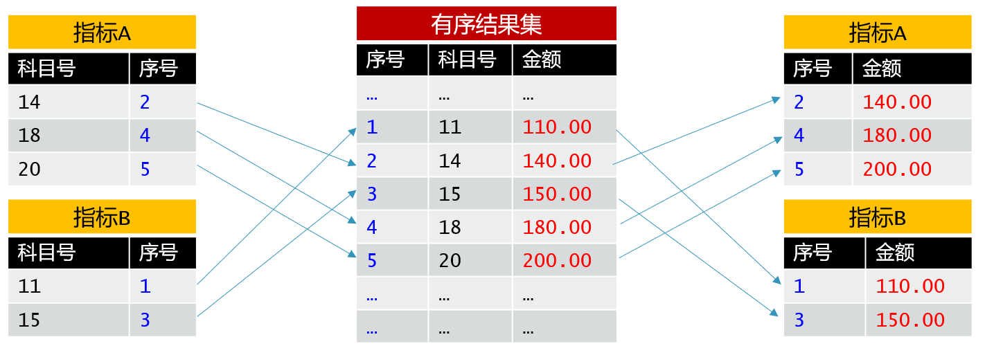 2、把查询指标的所有科目号合并,然后统一排序生成序号