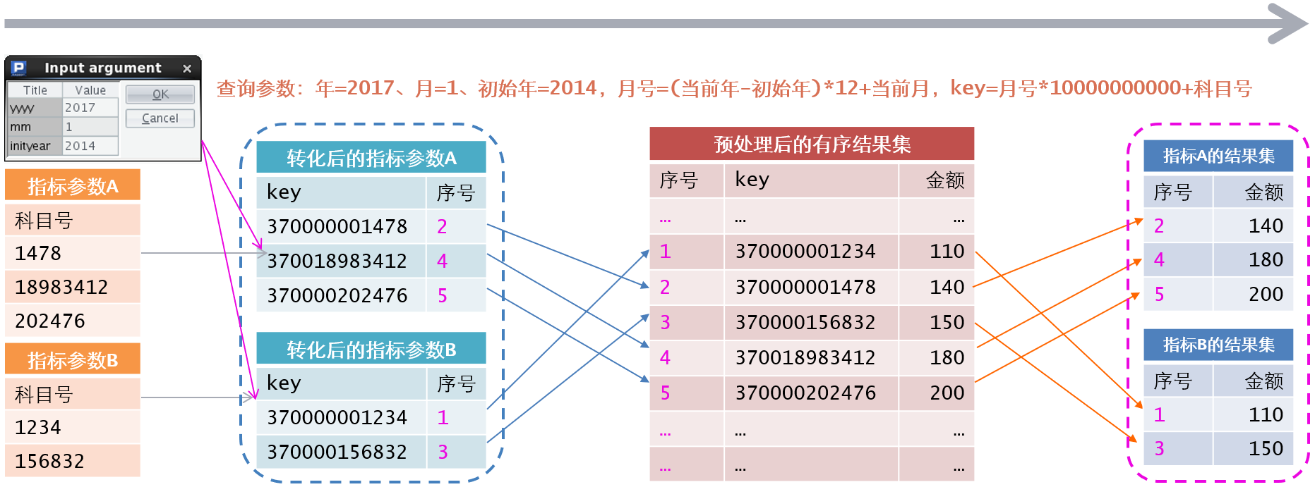 如果能利用数据有序直接进行有序查找,将能够获得更好的查询效率。利用有序查找时,单主键比多主键查找更快。在预汇总时,我们还可以将年、月、科目号合并为一个主键。这样就将问题变为了单键值下的批量有序查找。