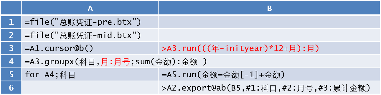 比如数据预处理的第一步:用年和月两列字段动态计算 "月号",按照科目、月号分组,统计本科目下月号的累计金额。只有 6 行代码:
