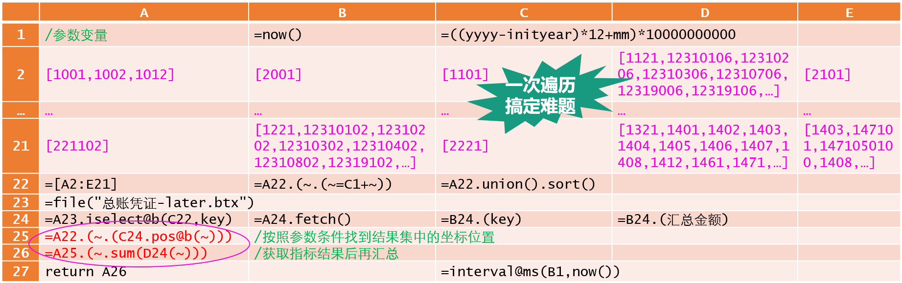 每个格子需要查找的科目号不同,比如 [1207,1214] 或者[1001, 1207, 153102,…],多个格子可能涉及相同的汇总项。常规方法需要对一次性批量有序查找出的结果按每个科目号再遍历后再去求和,即使用二分法在有序的 key 里找也需要计算量,如果可以直接按数据对应的位置找到累计金额汇总值再求和就会更快。