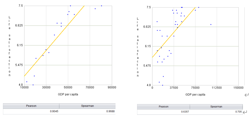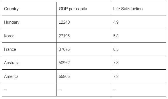 看出趋势了么,虽然数据中包含噪声,但仍然可以看出随着 GDP 增加,生活满意度或多或少呈线性上升的趋势。计算两者的线性相关系数能达 0.9 以上,似乎我们可以得出金钱能够让人感到快乐的结论。