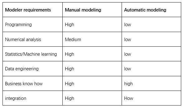 在用人成本方面,数据挖掘人才更是高居不下,通常只有大型企业的总公司才拥有少数技术团队。目前主流的人工建模方式,模型质量很大程度上取决于建模师的水平,同样的数据不同水平的人建出的模型完全不同,这样一方面模型质量无法保证,另一方面人才的流动会对数据挖掘业务产生重大影响,即使是之前开发好的模型,新来的员工对其更新,也要将整个建模过程重来一遍。