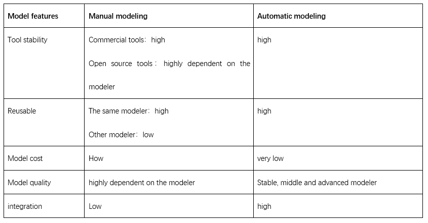 所幸的是,近年来自动建模技术的快速发展使我们已经能够帮助我们解决上述矛盾。自动建模技术会大幅度降低数据挖掘人员的门槛,一个普通的技术或业务人员经过简单的培训即可掌握,这样企业就可以快速的培养一批建模师,增加人才储备,降低建模成本。同时自动建模技术可以建立起一个模型工厂,由工厂自动化生产出来的模型质量稳定有保障,人才的流动也不会业务产生太大影响。 下表我们总结了人工建模和自动建模技术对建模师资格要求和模型特征。如表可见,相比于手工建模,自动建模技术对建模人员的要求非常低,输出模型的质量也稳定有保证。