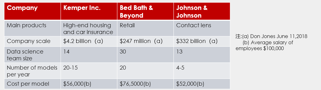 从经济角度分析,手工建模的方式生产效率低下,导致模型成本非常高,以下表中三家美国公司数据分析团队的模型成本为例,我们很保守的估计一个数据挖掘人员的年薪是 10 万美金(实际上远不止这么低),单位模型成本至少要在 5 万美金以上。而采用自动建模技术以后,生产效率至少会比原来翻几倍,模型成本也会大幅度下降,模型不再昂贵,可以广泛应用。