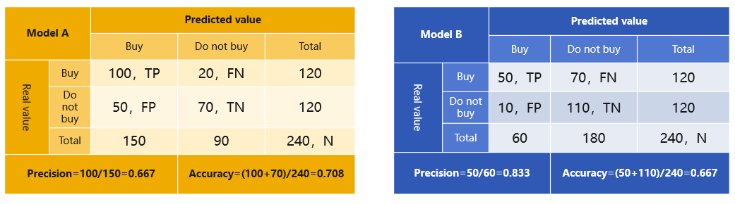 再来看一个精确率应用的例子,某企业希望销售 50 件产品,该企业建立了两个模型来选择待推销客户,混淆矩阵如下图,应该选择哪个模型?