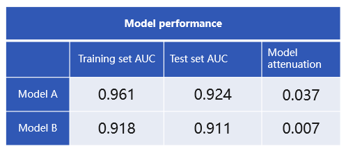 那么,模型衰减程度如何来考察呢,简单来讲可以看模型在训练数据和测试数据上的指标之差,它能够反映模型指标在预测数据(即未知数据)上的下降程度。如下表所示,模型 A 和模型 B 是在同一份数据上建立的两个模型,表中的数值是两个模型分别在训练数据和测试数据的 AUC 指标(AUC 是一种常用的模型评估指标,取值范围 0-1,越大越好)。如果仅从评估指标值的大小来判断显然使用模型 A 效果比较好,但是进一步分析模型在训练数据和测试数据上的指标变化,则发现模型 A 衰减比较快,存在一定程度的过拟合;反而模型 B 的 AUC 虽然低一些,但是衰减很小,在未知数据上的泛化能力比较好,模型比较稳定。因此应用的角度分析,模型 B 对未来数据的预测能力要好于模型 A。