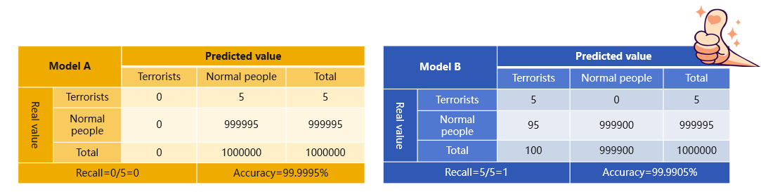 我们从一个夸张点的例子来入手讨论,机场识别恐怖分子,在 100 万人里有 5 个恐怖分子,因为恐怖分子是极少数,如果使用准确率来评估模型的话,那只要把所有人都识别成正常人,其准确率可以达到 99.9995%,但显然这种模型没什么意义,这时就需要建立一个查全率高的模型,比如两个模型的混淆矩阵如下: