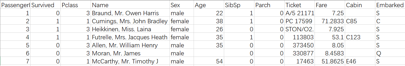 例如预测 titanic 幸存者数据见下图,就是一个结构化数据,数据的每一行表示一个乘客样本,每一列的属性都是相同的例如”Age”列都表示乘客的年龄,这样的数据是可以拿来建模的。