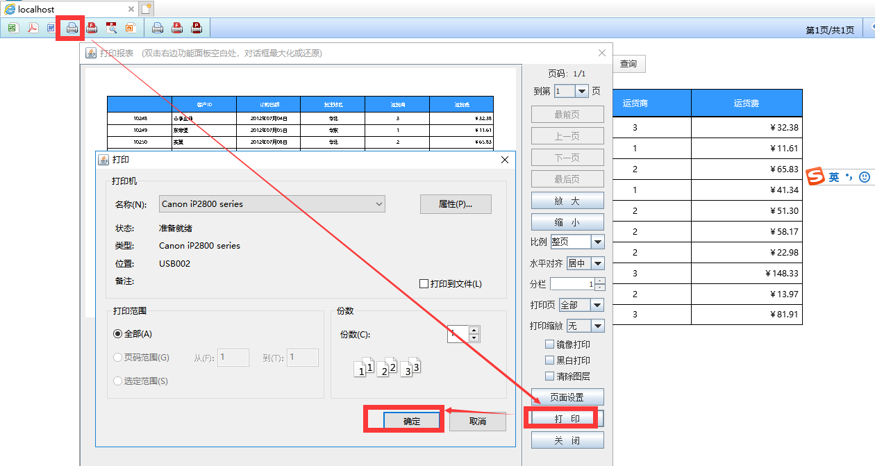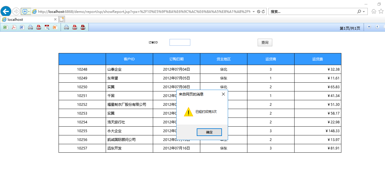 使用 showReport.jsp 展现一张报表,点击打印按钮,当我们进行打印操作后,页面会弹出打印次数的提示信息。