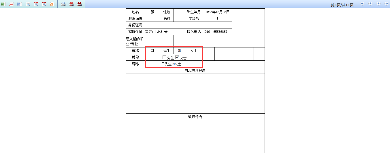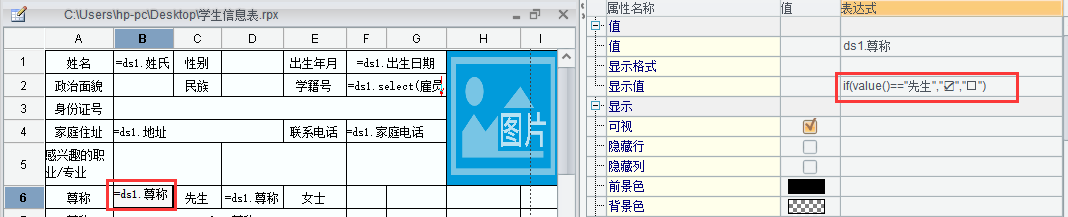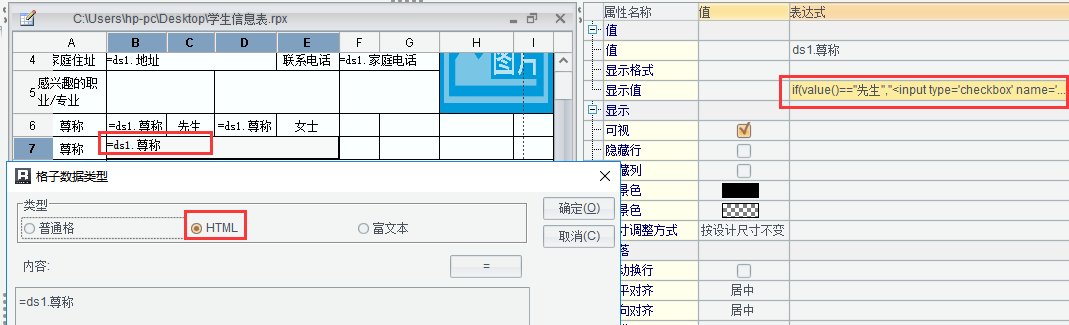 B7 单元格的表达式为 ds1. 尊称,单元格的数据类型设置为 HTML, 它的显示值表达式:if(value()==“先生”,“<input type=‘checkbox’ name=‘xs’  value=‘先生’ checked=‘checked’ /> 先生 <input type=‘checkbox’ name=‘ns’ value=‘女士’  /> 女士”,“<input type=‘checkbox’ name=‘xs’ value=‘先生’  /> 先生 <input type=‘checkbox’ name=‘ns’ value=‘女士’  checked=‘checked’/> 女士”)。