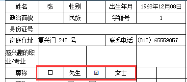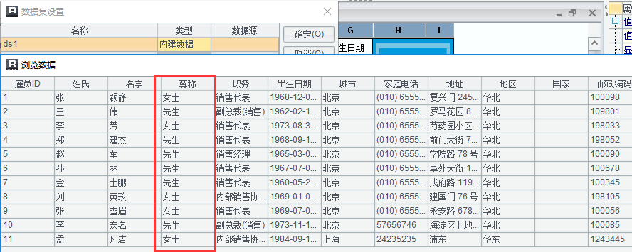 以雇员表中尊称字段为例,数据分别为”女士”,”先生”,根据数据雇员的不同尊称,显示相应的勾选效果。